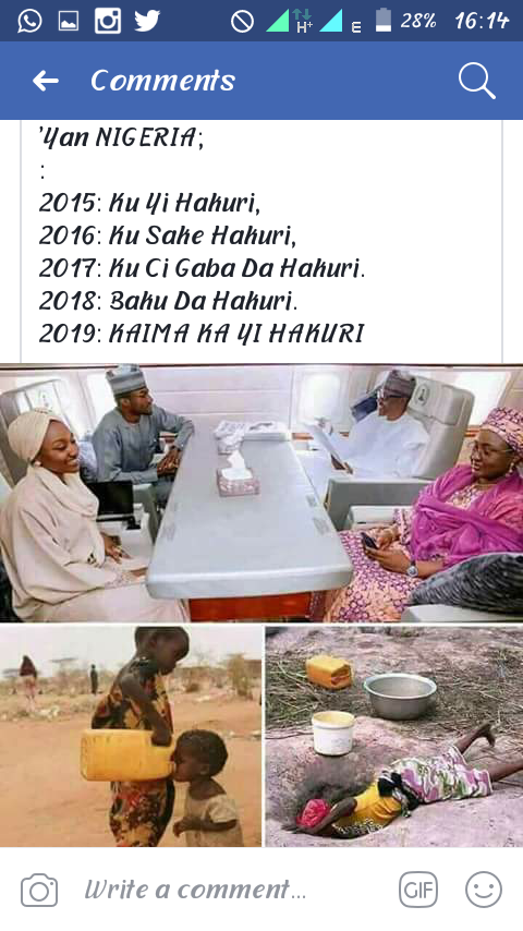 “Kayi ankuri” in Hausa means be patient in English. That is what a young Hausa man told Buhari in regards to 2919 elections comparing photos of himself in his presidential jet and some ordinary Nigerians drinking water from the mud. See what he wrote below