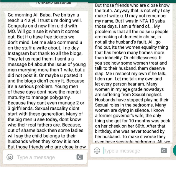 hmmm just this morning, Ali Baba shared very emotional WhatsApp messages sent to him a friend about what women go through in the hands of their