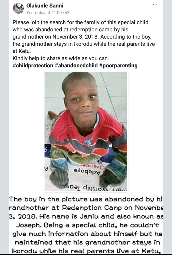 Please join the search for the family of this special child who was abandoned at redemption camp his grandmother on November 3, 2018. According to the boy, the grandmother stays in Ikorodu while the real parents live at Ketu.