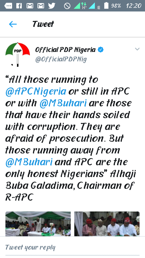 “All those running to @APCNigeria or still in APC or with @MBuhari are those that have their hands soiled with corruption. They are afraid of prosecution. But those running away from @MBuhari and APC are the only honest Nigerians” Alhaji Buba Galadima, Chairman of R-APC