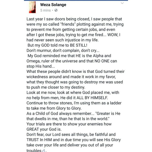 Angola actress Weza accuses her friends of plotting evil against herBy admin / January 11, 2017 Share thisFacebookXEmailWhatsApp An Angolan actress Weza Solange who is also Big Brother Africa alumni, accused her friends of closing doors of opportunity against her. See what she wrote on her social media handle below….