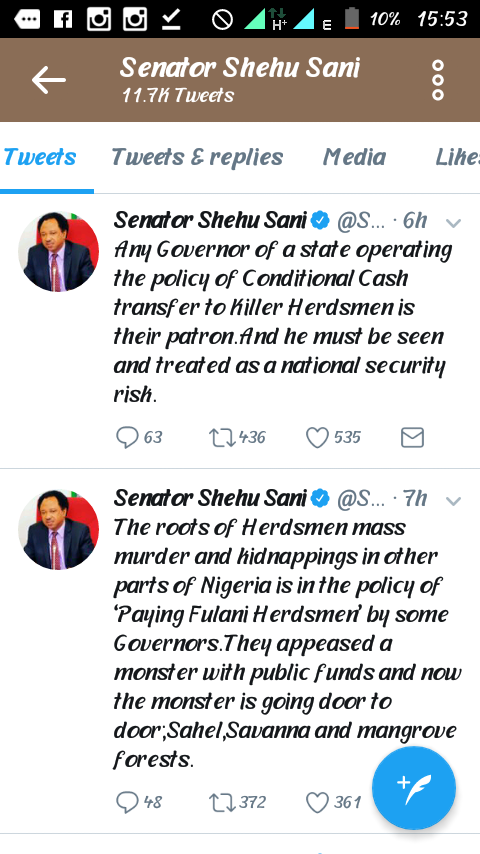 “Any Governor of a state operating the policy of Conditional Cash transfer to Killer Herdsmen is their patron. And he must be seen and treated as a national security risk.”