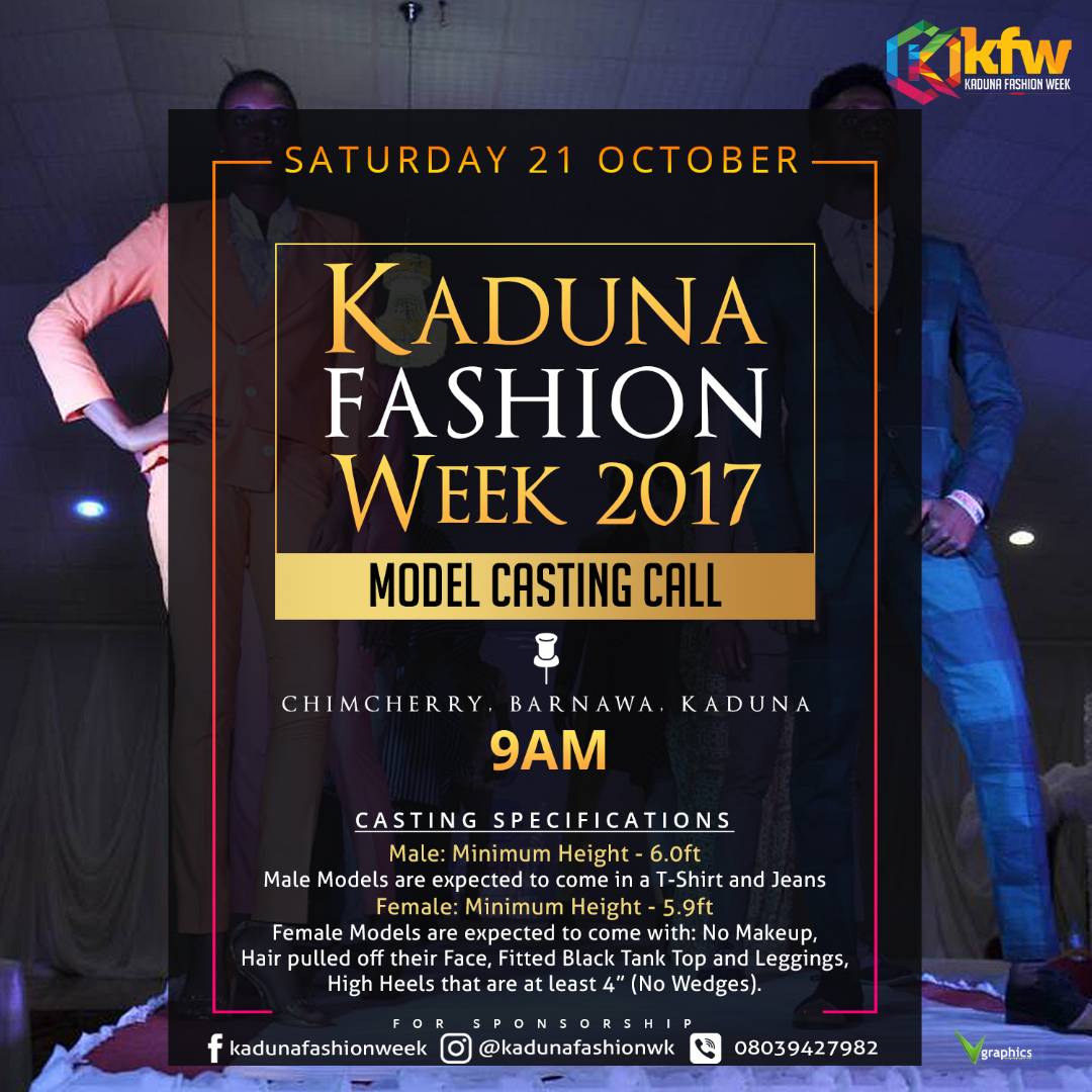 Kaduna fashion week was a hit last year 2016. This super fashion annual event is here again and its coming bigger. Just as fashion designers are being registered models are not left out. Male and female models are invited to partake in the model casting coming up on Saturday 21st October 2017 9am at Chimcherry Barnawa, Kaduna State. This is in heavy preparation for the Kaduna fashion event coming up this December 2017. Ladies are to come with no makeup, high heels of at least 4″ …. See flyers below for both male and female model casting specifications…