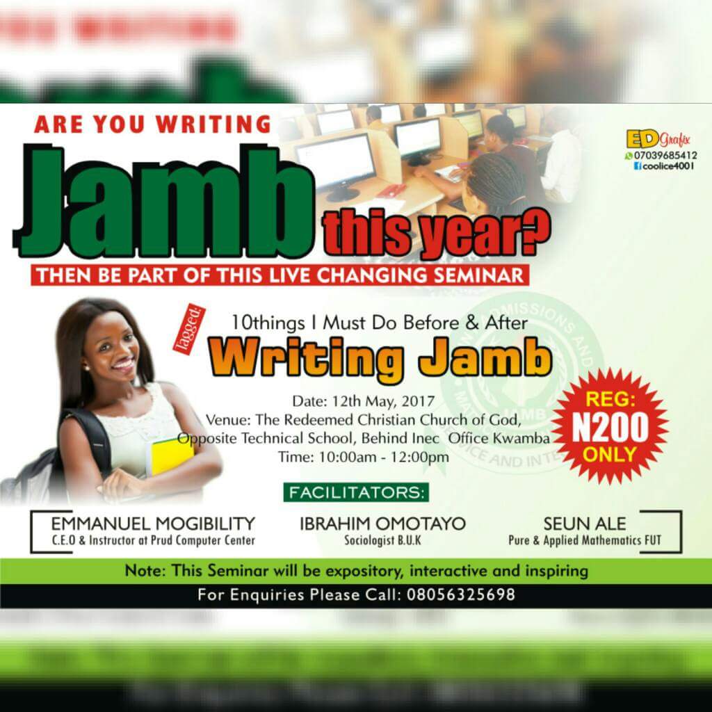 For those who want to write JAMB, you have a great privilege here for you. Make effort to attend this seminar. You will know those things needed to be done before and after JAMB. JAMB is just the corner you don’t have to miss this. Check flier below for all the details you need…