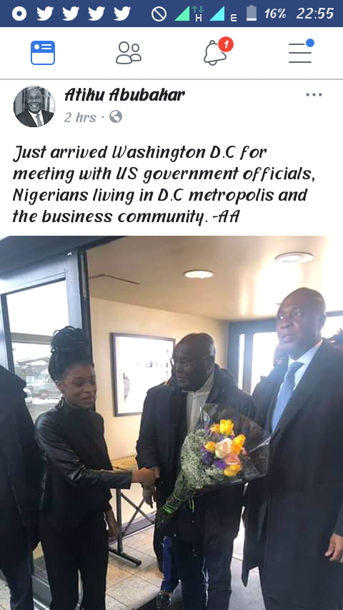 The People’s Democratic Party’s (PDP) Presidential candidate and former Vice President, Atiku Abubakar announced his safe arrival at Washington DC, America to meet with US government officials.