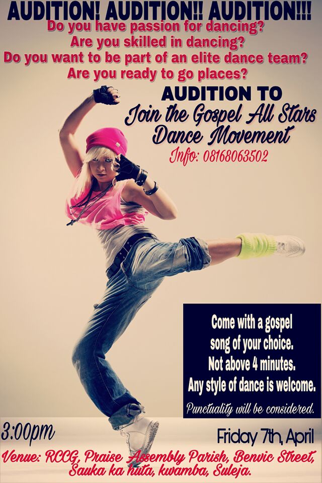 Can you dance? Do you have Passion for dance? Here is a free dance audition for you tomorrow 7th April 2017 3pm @ RCCG praise Assembly parish, Benvic Street Sauna kahuta, Kwamba Suleja, Niger State.