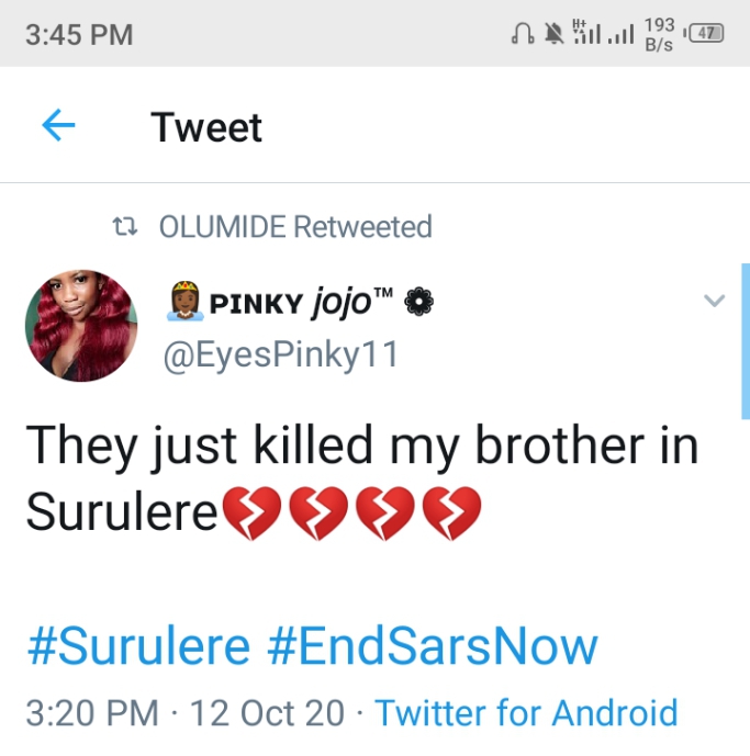 A Twitter user @eyespinky11 today Monday 12th of October 2020 tweeted that some SARS operatives shot her brother dead in