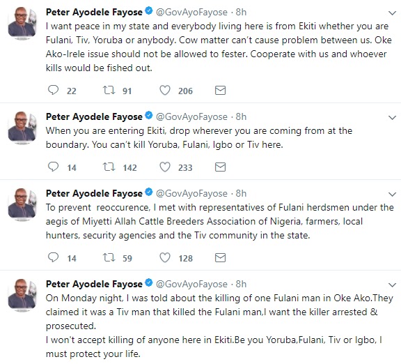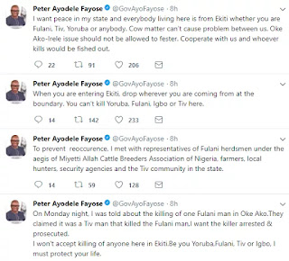 Just on monday 15th January 2018, a Fulani herdsman was killed in Oke-Ako, Ekiti state. Governor Fayose via his twitter condemned the act and has ordered an investigation to be carried out.