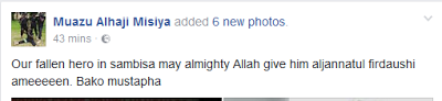 “Our fallen hero in sambisa may almighty Allah give him aljannatul firdaushi ameeeeen. Bako mustapha”… see more photos