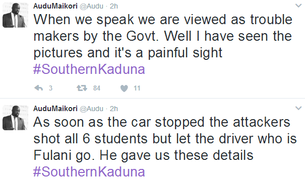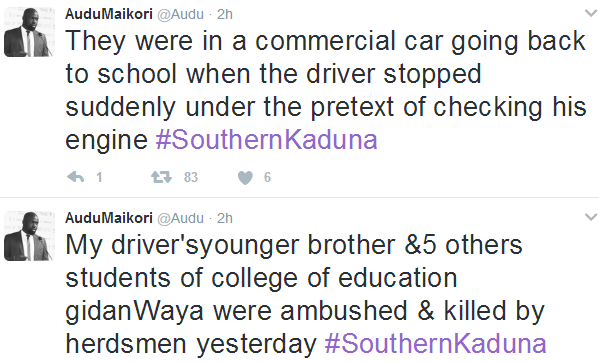 Sad news: As the crisis in Southern Kaduna continues, Audu Maikori shared the sad story of how his driver’s brother and five of his schoolmates at the College of Education, GidanWaya in Kaduna state, were ambushed and killed Fulani herdsmen while on their way back to school yesterday Sunday January 22nd. We hope that government rise to their feet and do something positive. Read his tweets below…