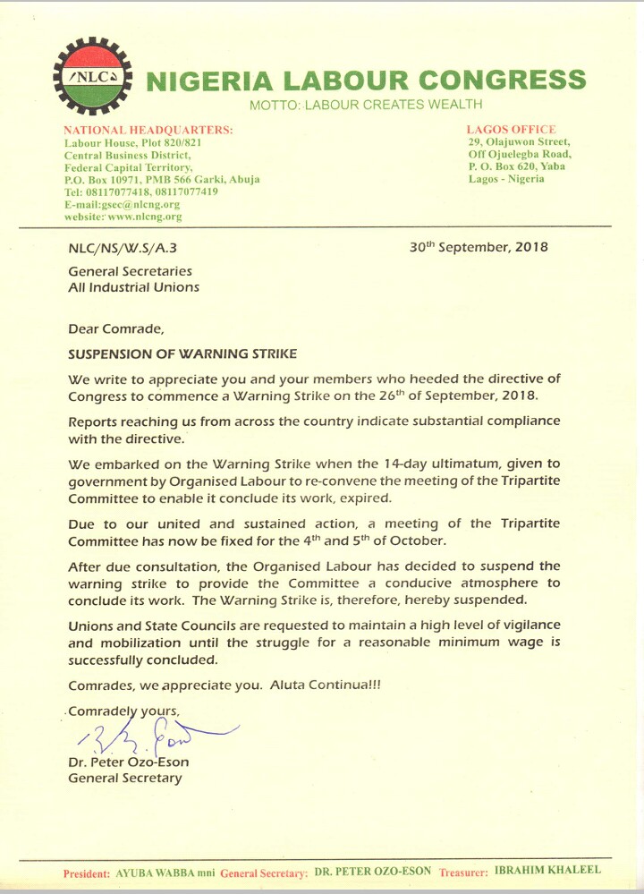 The Nigeria Labour Congress has today Sunday 30th September 2018 suspended the Nation Wide strike.