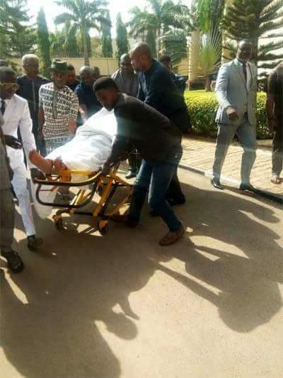 A Peoples Democratic Party (PDP) chieftain, Olisa Metuh, arrived the Federal High Court in Abuja, venue of his ongoing corruption trial on a stretcher after being taken down from an ambulance.