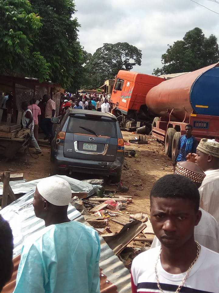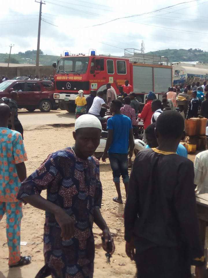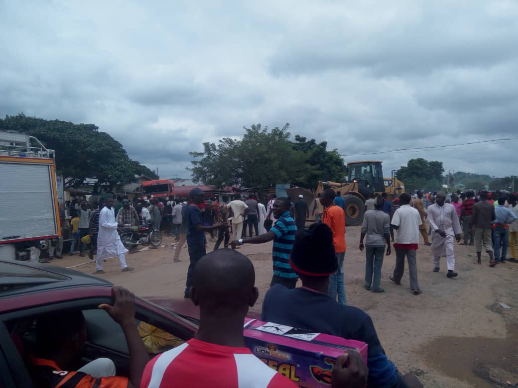 Eye witness reports that the vicinity of the accident,which is close to Mac Hotels opposite Kwamba Primary and secondary school in Suleja is full of blood with about 3 people who died instantly. There is great danger of sudden explosion of fire from the tanker because there is still fuel in the tanker that has crash several stalls from the market that is close to the Suleja Kwamba – Maje road. Already a rescue team from the Suleja Road safety corps RS7:22 , Nigeria army, fire service are on the scene of the tragic event.