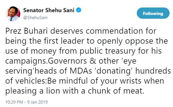 Buhari deserves commendation for being the first leader to openly oppose the use of government money for his campaigns – Shehu SaniBy admin / January 10, 2019 Share thisFacebookXEmailWhatsApp This is as shared on his Twitter handle