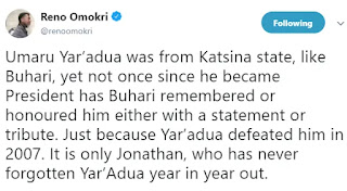 ”Buhari has never recognized or honored Umar Yar’Adua’s memory because he defeated him in 2007” Reno OmokriBy admin / May 6, 2018 Share thisFacebookXEmailWhatsApp