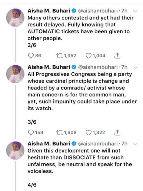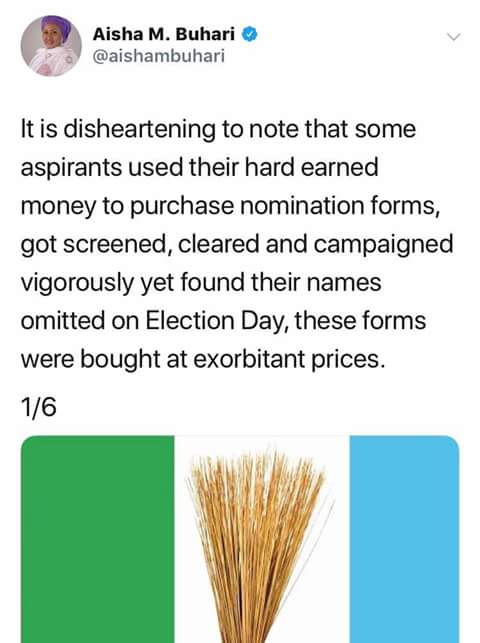 Buhari’s wife, Aisha blast APC for unfair primaries conducted.By admin / October 7, 2018 Share thisFacebookXEmailWhatsApp She shared her opinion via her Twitter handle. See tweet below: