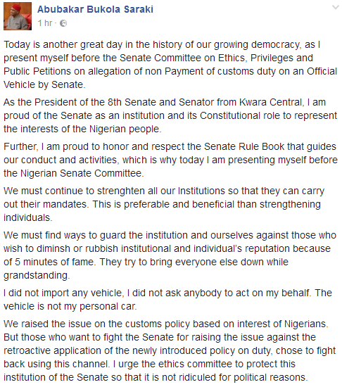 The Senate President, Bukola Saraki, has insisted he has nothing to do with the imported Range Rover Bulletproof SUV that he has been linked with and that he didn’t ask any one to stand on his behalf. He shared the above post on his facebook page. He also appeared before the Senate’s Committee on Ethics and Privileges to defend himself on allegations that he imported the SUV without paying the necessary Customs duty.