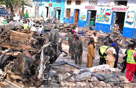 “We have so far collected 18 bodies and 20 wounded persons from one of the blast scenes,” Abdukadir Abdurahman Aden of the Aamin Ambulance told AFP.