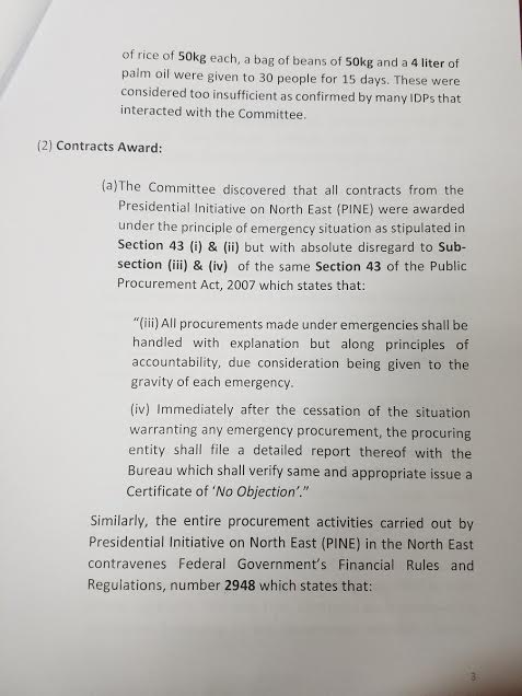 The committee in October heard of how a company was awarded a contract of N270 million just to clear grasses at IDP camps. The committee in its report, stated that it discovered that most of the contracts were bogus and awarded to government officials or their associates. Here is the report….