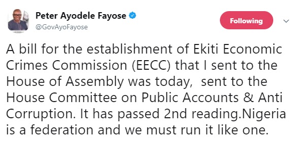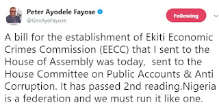 Federalism: Governor Fayose to establish the Ekiti Economic Crimes Commission (EECC)By admin / February 1, 2018 Share thisFacebookXEmailWhatsApp