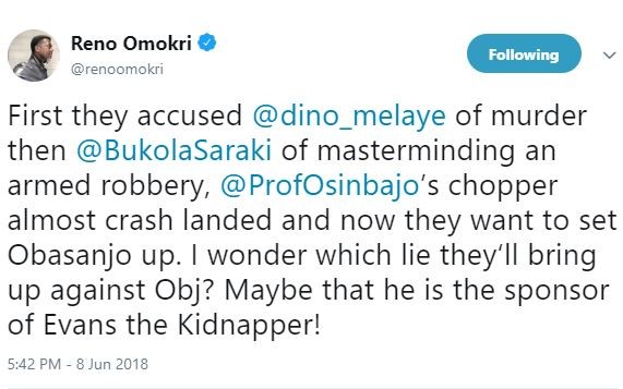 “‘First they accused Dino Melaye of murder, then Saraki of masterminding an armed robbery and now they want to set Obasanjo up’ – Reno OmokriBy admin / June 9, 2018 Share thisFacebookXEmailWhatsApp