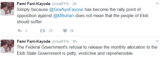 Former Aviation minister, Femi Fani-Kayode, has reacted to claims Ayo Fayose, that the Federal government has seized the January allocation of the state.By admin / February 15, 2017 Share thisFacebookXEmailWhatsApp