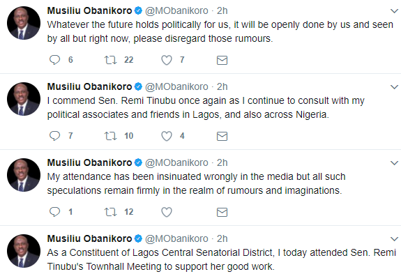 He’s come out to deny this claim. Reacting via his twitter handle, Obanikoro said he only attended the quarterly town hall meeting of his constituency hosted Senator Oluremi Tinubu and that his presence there was interpreted as him decamping to the APC. Read his tweet below…