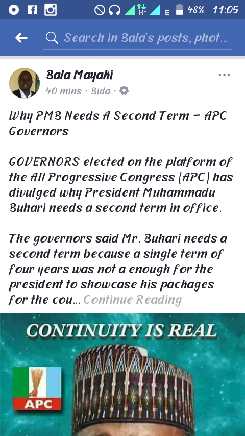 Just this morning a Facebook user, Bala Mayaki reported on his wall reasons Buhari needs a second term. Bala Mayaki wrote saying ccording to APC governors, Buhari needs a second term because four years isnt enough to show what he can do… Read the full report below…
