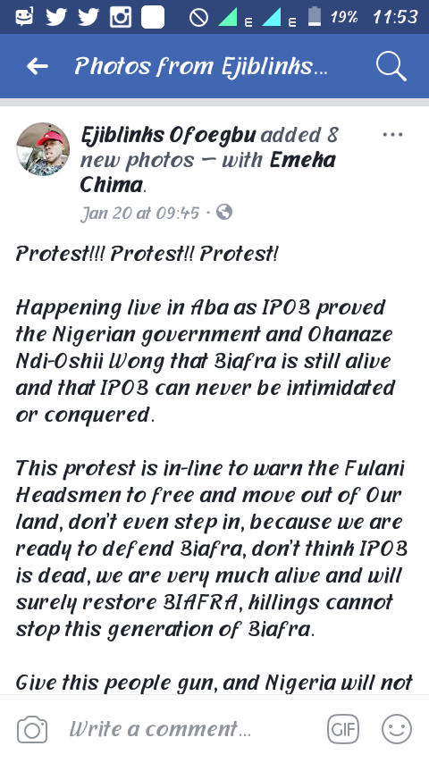 Yesterday 21st January 2018, Biafra agitators(IPOB) had a peaceful protest to prove they are not dead and still active. According to a Facebook user who posted photos on his wall said Fulani herdsmen shouldn’t make attempt coming towards South East. He further stated that all they want is for referendum to be conducted. Read .