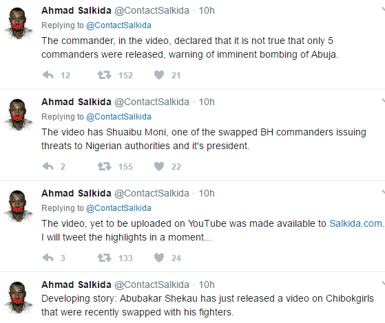 Hmmmm…Boko Haram commanders released in exchange for 82 Chibok schoolgrils. They threaten to bomb AbujaBy admin / May 13, 2017 Share thisFacebookXEmailWhatsApp See these tweets