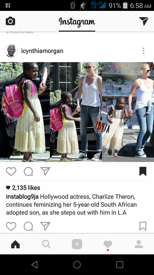 Just in the early hours of today Thuraday, Cynthia Morgan on her instagram page uploaded a photo of Hollywood actress Charlize Theron and her 5 year old adopted son from South Africa.