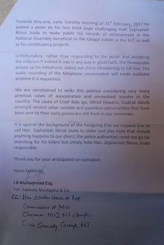 The threat came after the activist spoke against bad governance and mention the said honourable Zaphania… .After the threat, the activist who was threatened wrote to concerned and relevant authorities to intimate them about the threat from Honorable member. Below is the letter written the Lawyer of Buhun Barkonu, the phone conversation between the federal house of reps and the Buhun Barkonu plus his comments on his Facebook wall.