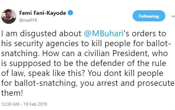 ‘I am disgusted about Buhari’s orders to his security agencies to kill people for ballot-snatching’ – FFKBy admin / February 19, 2019 Share thisFacebookXEmailWhatsApp