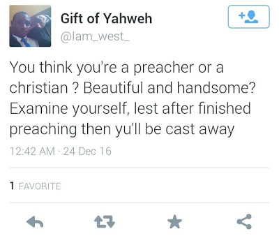 I DONT HAVE TIME FOR WORLDLINESS AND CARNALITY – A TWITTER PREACHERBy admin / December 24, 2016 Share thisFacebookXEmailWhatsApp a preacher on Twitter, twitted warning Nigerians about adding artificial things to their body. Twitter, warning Nigerians about the consequences of their personal decisions in life.
