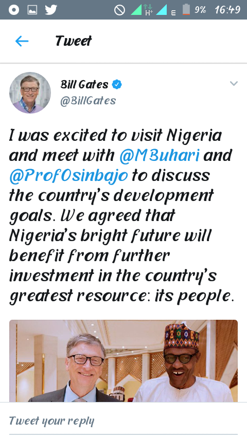 CEO of Microsoft Bill Gates was in Nigeria last week for a meeting with the Economic council headed the vice president Osinbajo. Bill Gates after the meeting took to his Twitter handle and expressed how glad he was to be in Nigeria. Read the tweets Bill gates below: