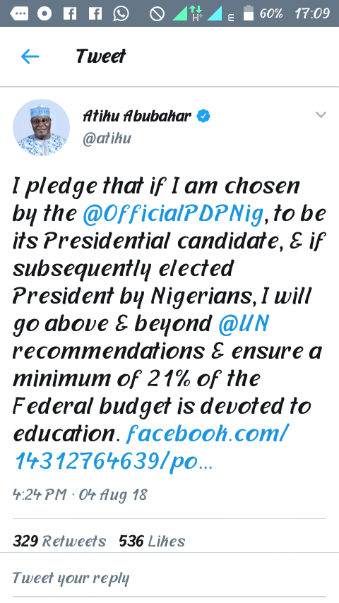 “I pledge that if I am chosen the @OfficialPDPNig, to be its Presidential candidate, & if subsequently elected President Nigerians, I will go above & beyond @UN recommendations & ensure a minimum of 21% of the Federal budget is devoted to education.”