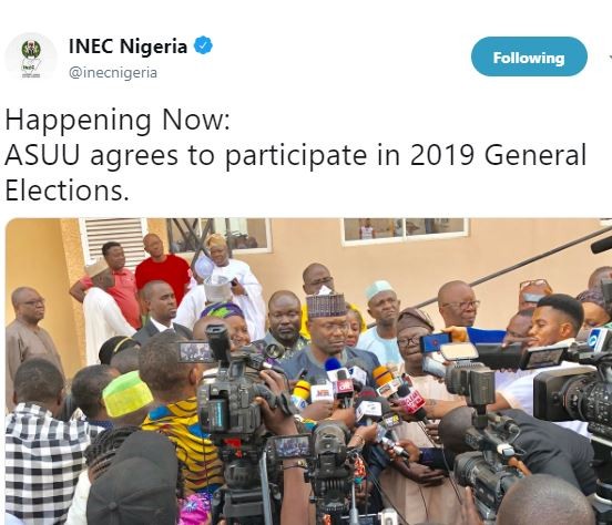 Despite the on-going strike action, INEC Chairman, Prof. Mahmood Yakubu just confirmed that ASUU has agreed to participate in 2019 General Elections.