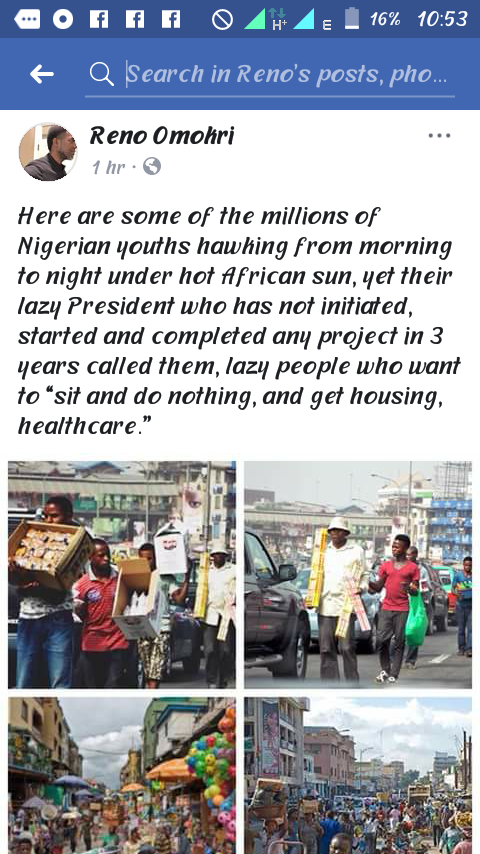 Here are some of the millions of Nigerian youths hawking from morning to night under hot African sun, yet their lazy President who has not initiated, started and completed any project in 3 years called them, lazy people who want to “sit and do nothing, and get housing, healthcare.”