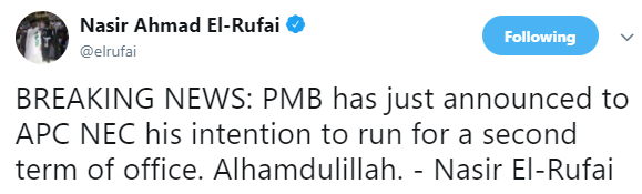 According to Governor El-Rufai, he announced his intention to APC National Executive Committee members.