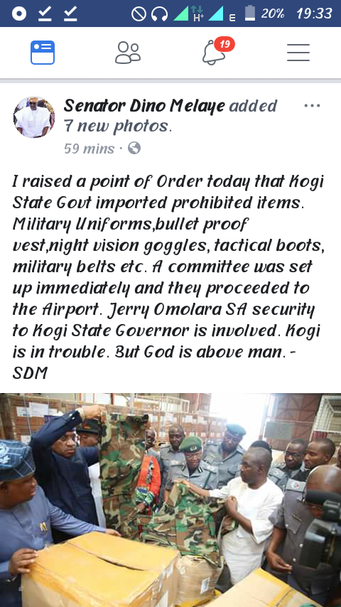 Senator Dino Melaye posted today that his state of origin Kogi state imported military uniforms and other items. He said this on his Facebook page. Read his post below….