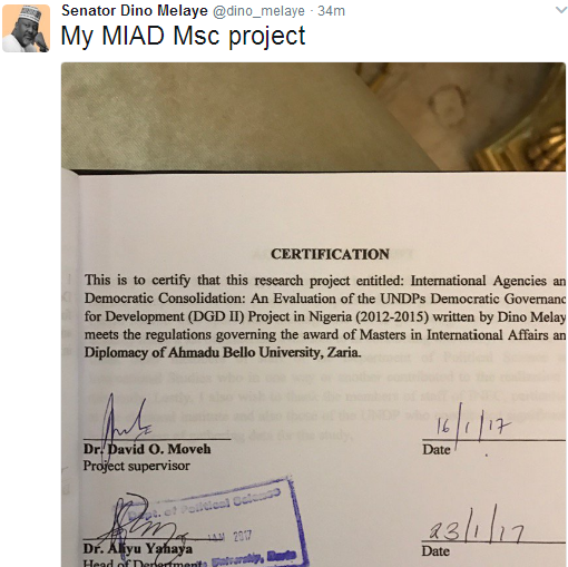 Dino Melaye this Thursday evening shared these screenshots from his MSc project for his International Affairs and Diplomacy from the Ahmadu Bello University. See below and also what his Twitter followers said….