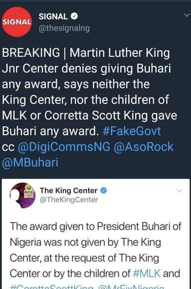 Martin Luther King Junior Centre denies giving Buhari any awardBy admin / November 4, 2018 Share thisFacebookXEmailWhatsApp What do you think ?