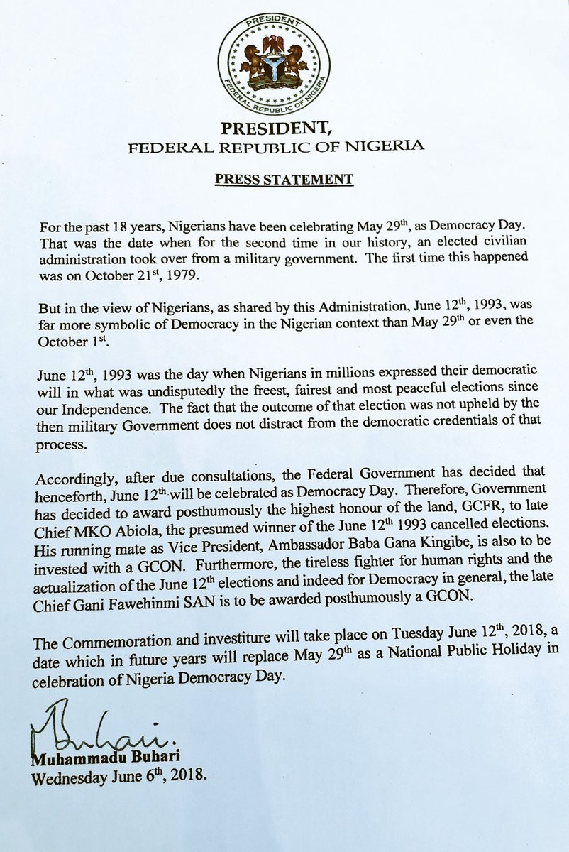 Nigeria New Democracy Day June 12: Read the complete declaration BuhariBy admin / June 7, 2018 Share thisFacebookXEmailWhatsApp President Buhari yesterday declared June 12th as the new date for Nigeria’s Democracy Day. Read his tweets and press release below…