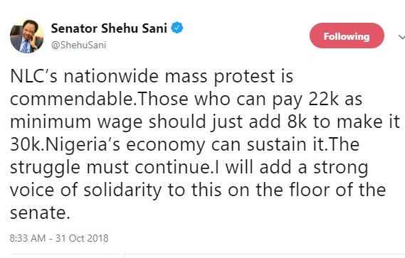NLC’s nationwide mass protest is commendable, the struggle must continue – Shehu SaniBy admin / October 31, 2018 Share thisFacebookXEmailWhatsApp This is as shared on his Twitter