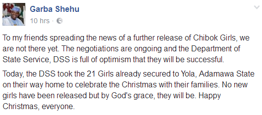 Senior Special Assistant to President Buhari on Media and Publicity, Shehu Garba, has debunked online speculations that another set of the abducted Chibok school girls have been released. Read his statement released on social media below