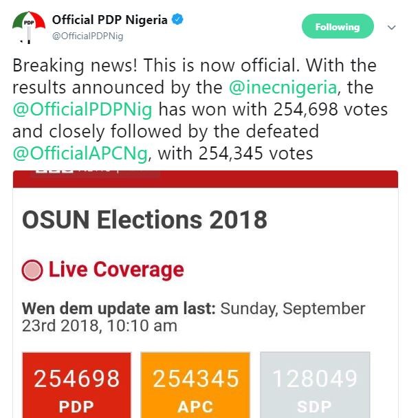 PDP claims victory in the 2018 Osun elections on TwitterBy admin / September 23, 2018 Share thisFacebookXEmailWhatsApp PDP shared this on Twitter