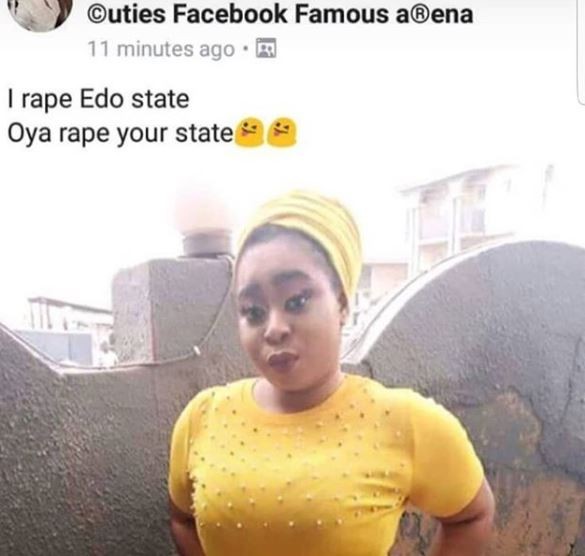 Photo of the day… Edo people come and seeBy admin / May 23, 2018 Share thisFacebookXEmailWhatsApp Edo girl says, “I rape Edo State”