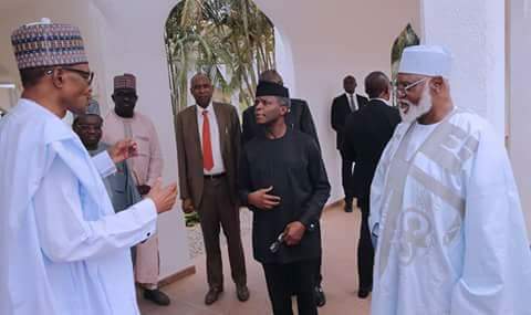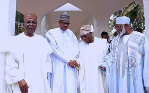 Today Thursday 22nd Feb., 2018, President Muhammadu Buhari was with Governors, Former Heads of State, General Yakubu Gowon, General Olusegun Obasanjo and Former Head of State, General Abdusalami Abubakar at the end of the National Council of State Meeting held at the State House in Abuja.