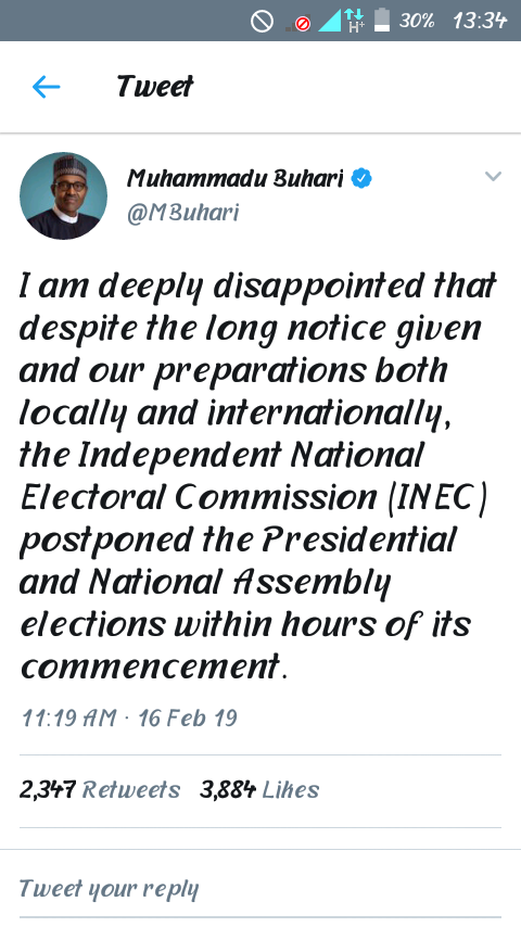 President Buhari expresses shock and disappointment as INEC postpones election. He said via his Twitter handle that he is disappointed on INEC that despite the long time preparation, the election is been rescheduled.