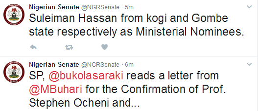 They are, Suleiman Hassan from Gombe state and Stephen Ocheni from Kogi state. They are expected to take over the ministerial slots of former Minister of the Environment, Amina Mohammed who is now the new UN Deputy Secretary-General and James Ocholi, former Minister of state for Labor, who died in a fatal accident in March 2016.
